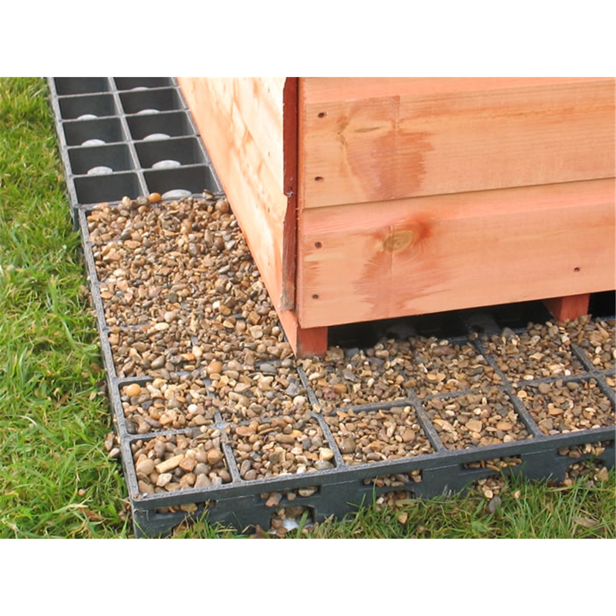 Design your EcoBase to be larger than your shed and fill the excess EcoBase with pea gravel to create a French drain which helps to prevent splash back of rain water and soil debris onto your timbers.